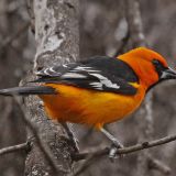 Male: orange head, lower back, belly and shoulder patch. Black throat, upper back, tail and wings. Similar male Hooded Oriole is smaller and lacks the orange shoulder patch.