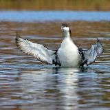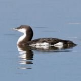 68 cm (27") Rare. Breeds in western Alaska. Once considered a sub species of the smaller Pacific Loon but often indistinguishable. It has a similar slender dark bill and the same checkered patches on the back. However, the iridescent neck or throat area may be seen to have more green than purple or black but this is difficult to observe. European form, with a purple throat, is accidental on East coast.