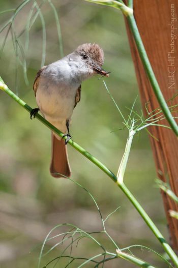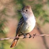 Gray-brown upperparts. Pale gray throat and breast. Pale yellow belly and undertail coverts. Rufous tail. Bill is shorter and thinner than similar Brown-crested Flycatcher.