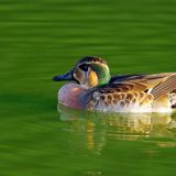 Female: similar to female Green-winged Teal but has a distinctive white spot at base of bill.