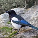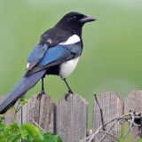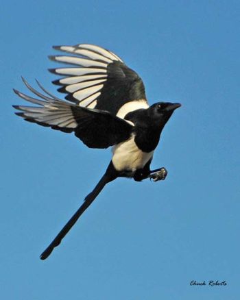 Unmistakable large black and white bird with a long black tapered tail. Tail is longer than the body. White patches in wings flash in flight. Wings and tail may show a greenish irridescence.