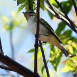 Song: monotonous, somewhat like Red-Eyed Vireo's but with paired phrases.