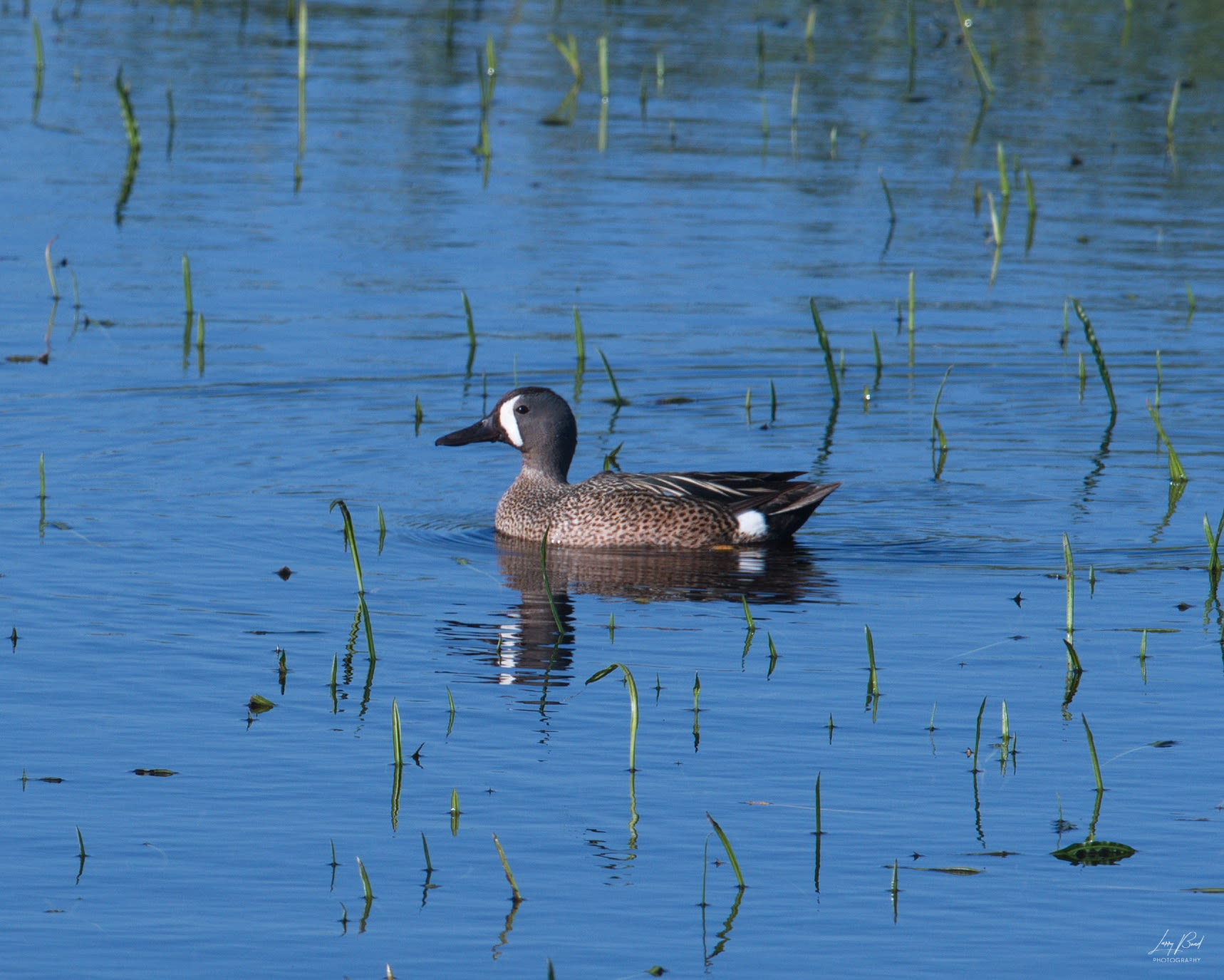 Female: mottled grayish brown overall; dark line through eye; white spot at base of slender dark bill. Very similar to female Green-winged and female Cinnamon teals.