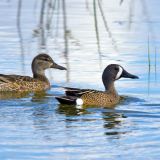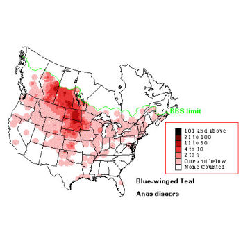 38-41 cm (15-16") Fairly common and widespread. Prairie potholes and sloughs, marshes, lakes, ponds, protected bays. Small surface feeding duck.