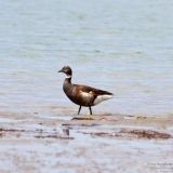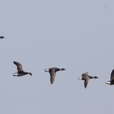 56-66 cm (22-26") Locally common. Arctic coast in summer, coastal bays in winter. Regular in Great Lakes region and Salton Sea. Small, stocky, short-necked sea goose. All-black head and bill; neck is black with white markings on either side, in western subspecies these patches join in front forming a white collar; grayish-brown upperparts; gray sides; black breast; white rump. Fly low over water in long lines.