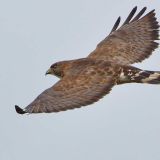 Chunky crow-sized buteo. Dark brown above; reddish-brown barring below; tail has broad black and white bands.