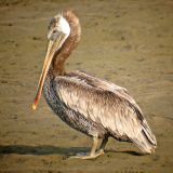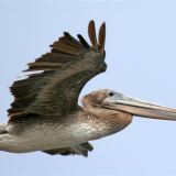 122 cm (48") Wings 213 (84") Locally common on both coasts, rare inland. State bird for Louisiana. Large bird with grayish brown body and large bill. Hindneck is variable in color; chestnut when breeding otherwise white. White or yellow on head. Makes spectacular dives into sea from air to catch fish.
