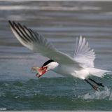 48-58 cm (19-23") Fairly common. Inland along rivers and lakes as well as seacoasts. Our largest tern, crow-sized. Flies and acts much like a gull. White head with a crested, black cap; stout, bright red bill; white underparts; gray mantle; broad wings show dark on underside at tips. Similar Royal Tern does not range inland and has a white forehead in winter.