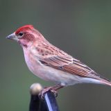 Male: resembles male Purple Finch in being mostly red but it has a contrasting crown; brown hindneck contrasts abruptly with red on cap. Undertail coverts streaked.