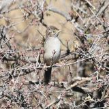 Streaked gray-brown upperparts. Unstreaked underparts. Long rounded dark gray-brown tail with white tips (seen best in flight).