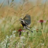 Male: black and white head. Buffy face. Chestnut on hind neck. Streaked brown back. Black breast (some may have chestnut on breast). White lower belly and undertail coverts.
