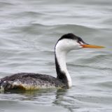 Goose-sized grebe with a long swan-like neck. Contrasting black and white, black above, white below; black cap stops just above eye; long thin pointed orange-yellow bill. Very similar Western Grebe has a greenish-yellow bill, its black cap extends below the eye and its wing stripe is less pronounced.