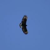 Very broad wings. Short broad tail. All dark except for whitish spot near tip of wings seen in flight and white band at base of tail and narrow white terminal band. Suggests a Black Vulture.