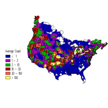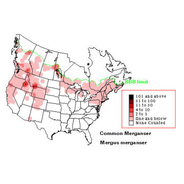 56-69 cm (22-27") Common and widespread. Wooded lakes, ponds, rivers. Large fish-eating duck with a long pointed red bill. The bill is thicker at base giving forehead a more sloping appearance than similar Red-breasted Merganser.