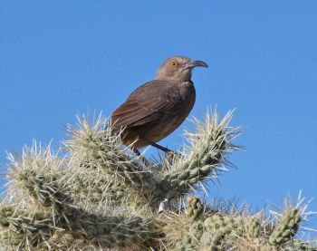 Grayish upperparts. Strongly curved bill. Pale orange eye. Southeastern Arizona and Texas birds have heavily mottled or spotted breast and white at tips of tail. Other birds have indistinct spotting on the breast.