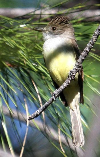 Dark bushy crest. Brown olive back. Gray throat and breast. Yellow belly and undertail coverts. Dark tail with a little rufous on it. Similar to the larger Ash-throated Flycatcher.