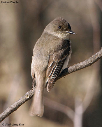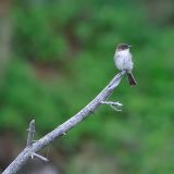 Dark head, no eye ring, no wing bars. Upright posture and tail wagging habit help identify this flycatcher. Told from pewees by its darker head than back and lack of wing bars. Empidonax flycatchers have eye rings and wing bars.