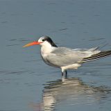 43 cm (17") Rare. Pacific coast. Breeds in Mexico, wanders north after breeding season. Suggests a small Royal Tern but it has a longer slimmer reddish-orange bill and longer crest. Forked tail.