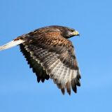 In flight; dark legs form a V against white underparts, tail is light and unbarred.