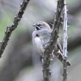 Dark brown upperparts. Throat striped with five black and white stripes. Gray breast and sides. Black spot at base of breast.