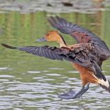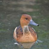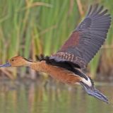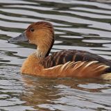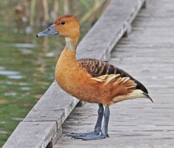 Goose-like duck. White stripe on side. Dark bill. Bluish feet. Was called Fulvous Tree Duck.