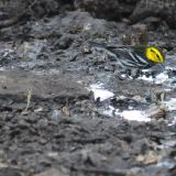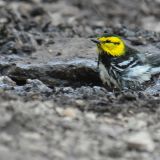 Male: black back. Black crown. Yellow face with a black line through eye. Black chin, throat and upper breast. White belly. Heavily black streaked sides. Similar Black-throated Green Warbler has a green or olive back and may have yellowish on the underside.
