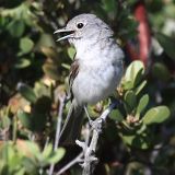 Gray upperparts. White underparts. Faint eye ring. Faint wing bars. Resembles Bell's Vireo but Bell prefers moist habitats. And like Bell it will twitch its tail like a gnatcatcher.