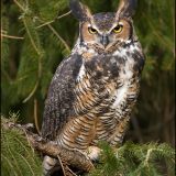 Large yellow eyes and widely spaced ear tufts or "horns" gives it a catlike appearance. Larger size, white throat, and finely barred breast and belly distinguish it from Long-eared Owl. Much larger than crows that often pester it.