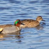 Female: dark mottled gray-brown overall; dark streak through eye; green iridescent patch from speculum is usually visible near back end of body; small dark bill. Told from other female teals by smaller bill and light undertail coverts.