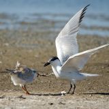36 cm (14") Uncommon. Atlantic coast, Pacific Coast, Salton Sea, California. Salt marshes, fields, coastal bays. Whitest tern. Thick black gull-like bill. Long black feet. Broad white wings. Slightly forked tail. Looks and flies like a gull. Seldom dives, rather hawks for insects.