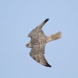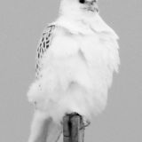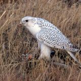 World's largest falcon - crow size; heavy-bodied; long, broad wings. When perched, long tail extends beyond wing tips. Three distinct color phases.