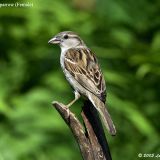Female: drab bird often confused with other sparrows. Brownish streaked back; buffy eyebrow; plain unstreaked grayish breast; white wing bar not always visible.