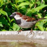 Male: gray crown; gray to white cheeks; rich brown back and nape; black bill and bib; white wing bar. Rural birds are much brighter and cleaner than their city cousins.