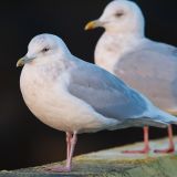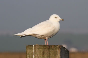58-66 cm (23-26") Uncommon along northeastern Atlantic coast, rare on Great Lakes. A pale crow-sized gull. White head, underparts and tail; pale gray mantle with whitish or pure white primaries - without the black wing tips; usually yellow but sometimes brown eyes; short, slender, yellow bill with red spot; flesh-colored legs. Folded wings extend beyond the tail. Glaucous Gull is similar but is larger with a stouter bill.
