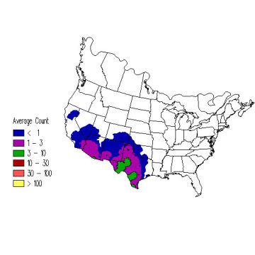 18 cm (7") Fairly common. Southwestern United States. Dry brushland, mesquite and cactus country, towns, suburbs.