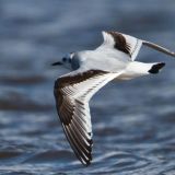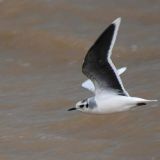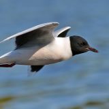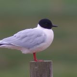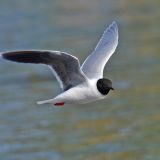 28 cm (11") Uncommon. European species now breeding around Great Lakes and at Churchill, Manitoba; winter visitor on east coast. Smallest gull - Robin-sized. Buoyant, tern-like flight. Solid black head - no eye-ring; small black bill; white underparts and tail; pale gray mantle, white wing tips, underside of wings blackish; red legs.
