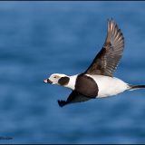 41-56 cm (16-22") Fairly common. Tundra pools and lakes in summer, winters at sea or along protected inshore coastal areas and large lakes. Short-billed diving duck with a long needlelike tail. Was called Oldsquaw.