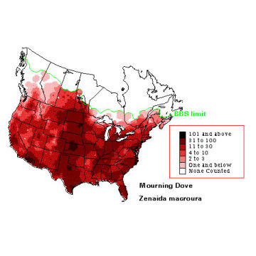 30 cm (12") Our most abundant and widespread dove. It is found across the United States and southern Canada in open fields, parks, lawns, feeders.