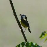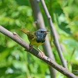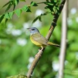 Male: lack eye ring and may have black on throat and breast. Greenish back and wings. Yellow lower breast, belly, and undertail coverts.