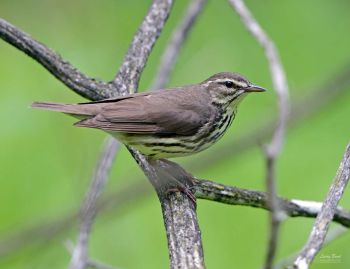 Dark upperparts. Heavily streaked light underparts. Told from similar Louisiana Waterthrush by its buffy eyebrow stripe that does not widen behind the eye, lack of contrast between sides and underparts, and duller legs.