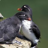 25 cm (10") Fairly common. Alaska. Winters south to California. Broad upturned orange-red bill. White plume feathers extend behind eye. Uniformly slate gray above, white below.