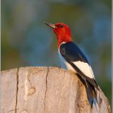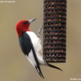 Head, neck and throat are all red; underside is pure white; back is black; wings are black and white; white rump.