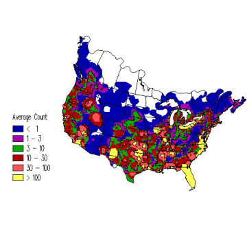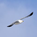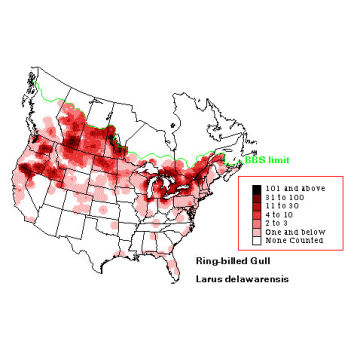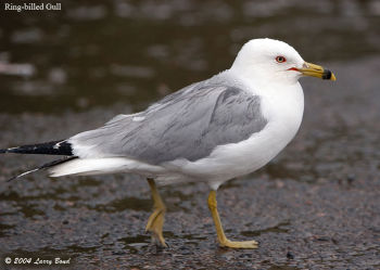 48 cm (19") Abundant and widespread. Coasts, lakes, urban areas, fast-food restaurants, dumps, fields. Crow-sized gull. White head, underparts and tail; gray mantle; black wing tips with large white spots; yellow eyes; thin yellow bill with dark ring around it near tip; yellow legs.