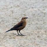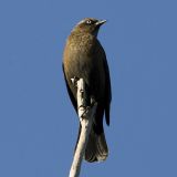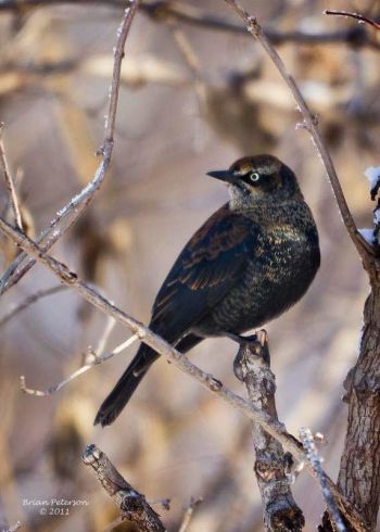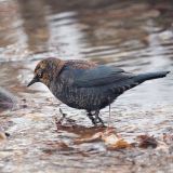23 cm (9") Fairly common. Summers in northern spruce bogs, wooded swamps, mustkegs; winters to southeastern United States in woods and fields near water. Rare in open fields with other blackbirds. Yellow eyes.