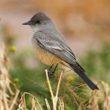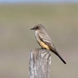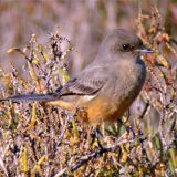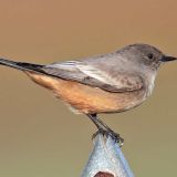 Grayish brown overall with a darker head. Pale rusty belly and undertail coverts. Black tail is frequently wagged.