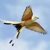 Pale gray body; pink sides; in flight, bright pinkish-orange underwings. Extremely long split tail. In spring males give spectacular courtship display flights.