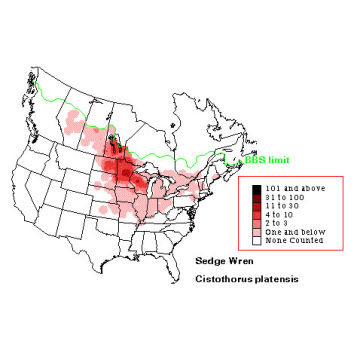 11 cm (4-5") The Sedge Wren is uncommon and local in central and eastern North America. Grassy marshes, sedges, grassy meadows.