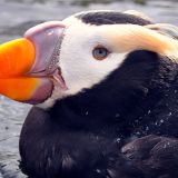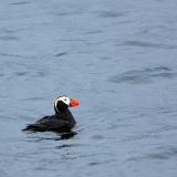 38 cm (15") Stocky dark Pacific Ocean sea bird with massive laterally flattened red bill.