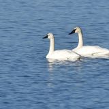 White swan with black bill. Holds neck straight up. Small yellow spot at base of bill. Was called Whistling Swan.