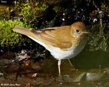 Uniform warm or cinnamon brown above; whitish below with buff on upper breast. No distinct eye ring. Breast spotting is less distinct and more limited than on other thrushes.